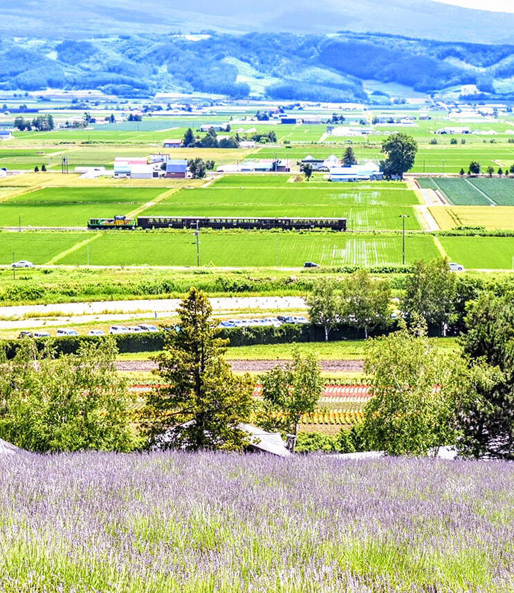 ラベンダー畑のむこうには、富良野線の人気観光列車「富良野・美瑛ノロッコ号」が行く姿。そのむこうには、富良野岳の連なる山々。