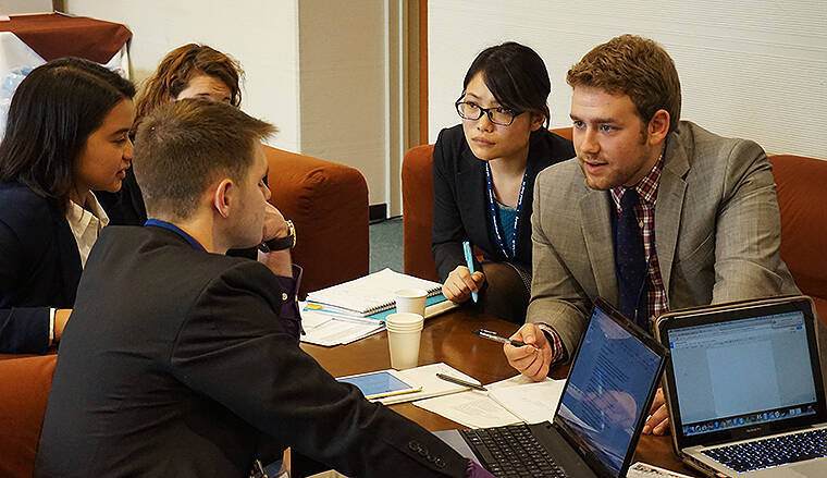 模擬国連世界大会では、参加する学生は4つの議場に分かれて議論。各議場では事前に2つのテーマが設定され、大会当日に議論するテーマをひとつ決定する。
