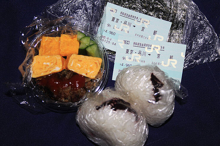 夏休みが終わり、平日朝6時台の客層は、こちらと同じくビジネス客と思しき人たちが多い。きょうも定例出張ってことで、うちでおにぎり弁当をつくり、小田原を過ぎたあたりで開け始める。