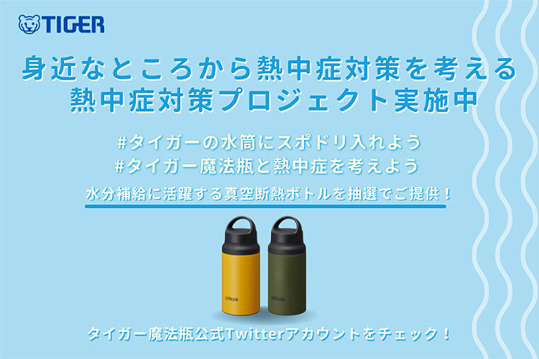 すでに4万人以上が同プロジェクト施策に参加し、予想を超える参加者数と、熱中症に関する注目度の高さを受け、Twitter「#タイガーの水筒にスポドリ入れよう」真空断熱ボトル&アクエリアスパウダープレゼントを継続していく。