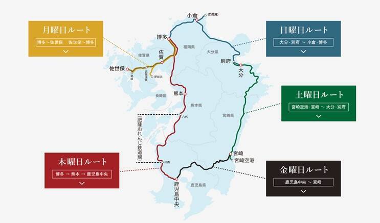 「36ぷらす3」新月曜日ルートは、博多駅 11:22発 佐世保駅 16:13着の佐世保行きと佐世保駅 17:31発 博多駅 20:06着の博多行きが設定されています。佐世保行きの途中停車駅は佐賀駅、肥前浜駅、武雄温泉駅、上有田駅、早岐駅。博多行きの途中停車駅は早岐駅、有田駅、武雄温泉駅、江北(旧肥前山口)駅、佐賀駅、新鳥栖駅、鳥栖駅です。