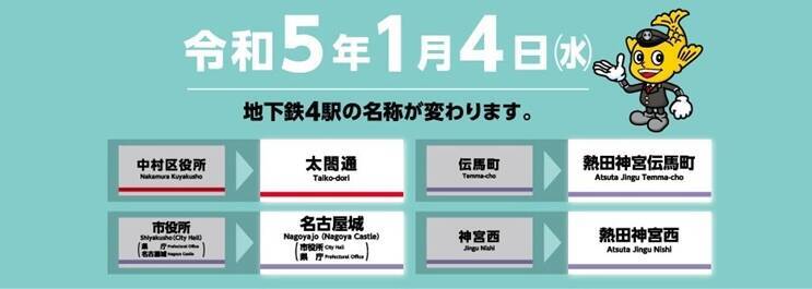 名古屋市営地下鉄の4駅が、2023年1月4日から新しい駅名称に変更されます。