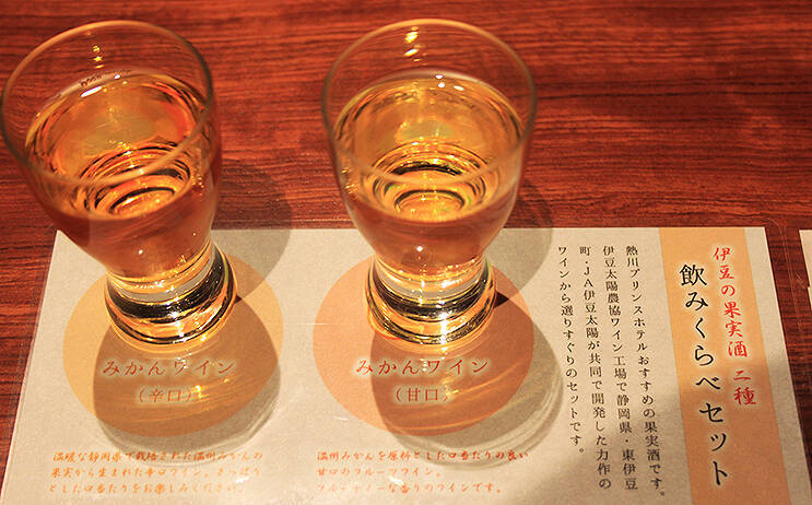 そこに、静岡の地酒 利き酒 3種セット「正雪・吟醸生」「志太泉・純米」「熱川・本醸造」と、伊豆の果実酒二種飲み比べセット(みかんワイン辛口&甘口)をつけて……。