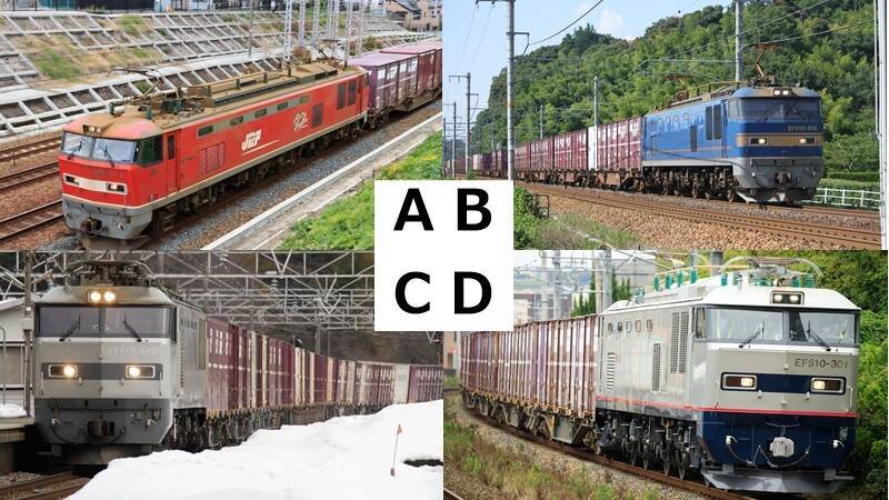 また、DのEF510は「300番台」と呼ばれ、九州で今なお活動している国鉄時代の機関車の置き換え用として2021年に作られたもので、この中では最も新しいグループです。なお、問2で出ている両数は2023年1月現在のものであり、300番台が今後増備されるため将来的にDタイプのEF510の両数はもっと多くなります。