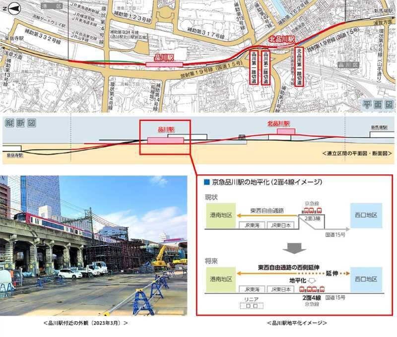 品川駅付近)泉岳寺~新馬場駅間は、八ツ山通りの品川第1踏切道をはじめとする3か所の踏切道が存在し交通渋滞の要因となっているため、高架化し3か所の踏切道を除却いたします。また品川駅の地平化および2面4線化を図るため2023年度も工事を推進し早期事業完了を目指してます。