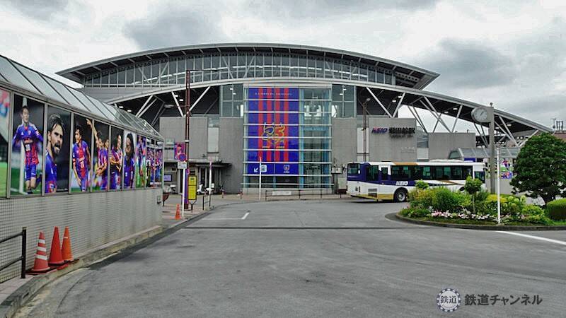 京王八王子側「スタジアム通り」の公道踏切から。「味の素スタジアム」以前の簡素な駅舎を思い出すと同じ場所とは思えません。(笑)