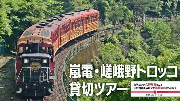 女子鉄アナウンサー・久野知美さん、元名物鉄道広報マン・福原稔浩さんと京都の人気鉄道「嵐電」「嵯峨野トロッコ列車」を貸し切り、京都・嵐山方面を巡るツアーが企画されています。