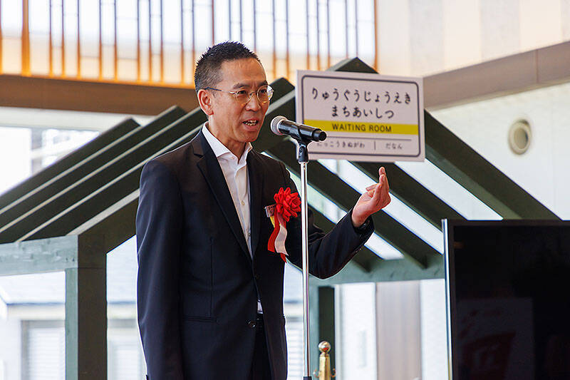 「みずほ銀行にいたときに、ホテル三日月さんを担当していた。苦しい時代もいっしょに議論し、いままで駆け抜けてきた。わたしは、みずほフィナンシャルグループのなかでも、3番目ぐらいのテッチャンと自負している。この“鉄道・バス好きのリゾート空間”は、ファンにはたまらない好物。卓越したリーダーシップの小高さんと、ホテル三日月スタッフ、千葉ローカル鉄道3社と、オール千葉でなしえたこのリゾート空間は、成功することを願っている」