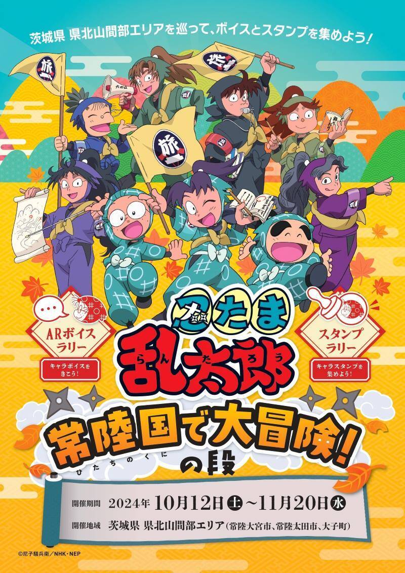 茨城県の県北山間部にて、NHKアニメ「忍たま乱太郎」とコラボレーションした周遊企画「忍たま乱太郎 常陸国で大冒険!の段」が開催されます。期間は2024年10月12日(土)~11月20日(水)。