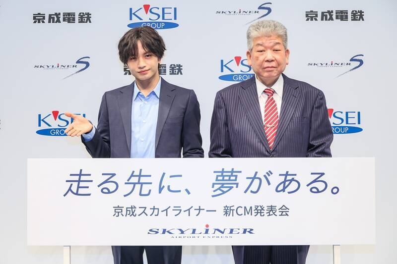 都内で12日、京成スカイライナーの新CM発表会が行われ、イメージキャラクターを務める中島健人さん、京成電鉄の小林敏也社長が登壇しました。