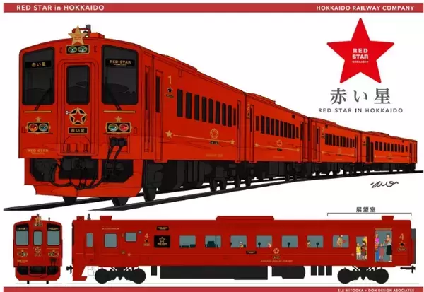 キハ143形を改造し、2026年度春から新観光列車「赤い星」「青い星」の運行をスタート。車両の仕様はJR北海道と水戸岡鋭治さんが共同で検討し、ある程度の共通性を持たせつつもグレード差を設けます。