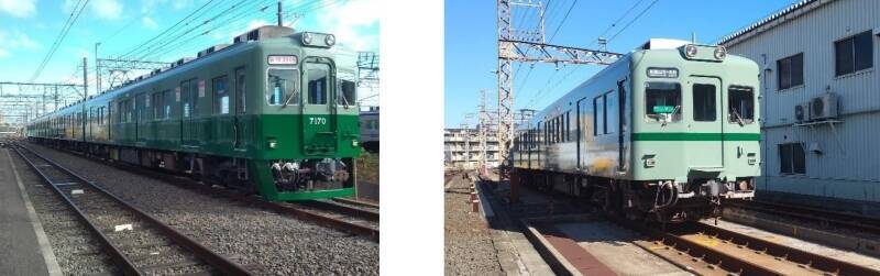 撮影会では、約30年前のデザイン「オリエンタルグリーンの車体にエメラルドグリーンの帯(当時は22000系)」を施した2200系の2両と、「濃淡グリーンのツートンカラー」を施した7100系の4両が並びます(※7100系車両の識別灯はLED化)。
