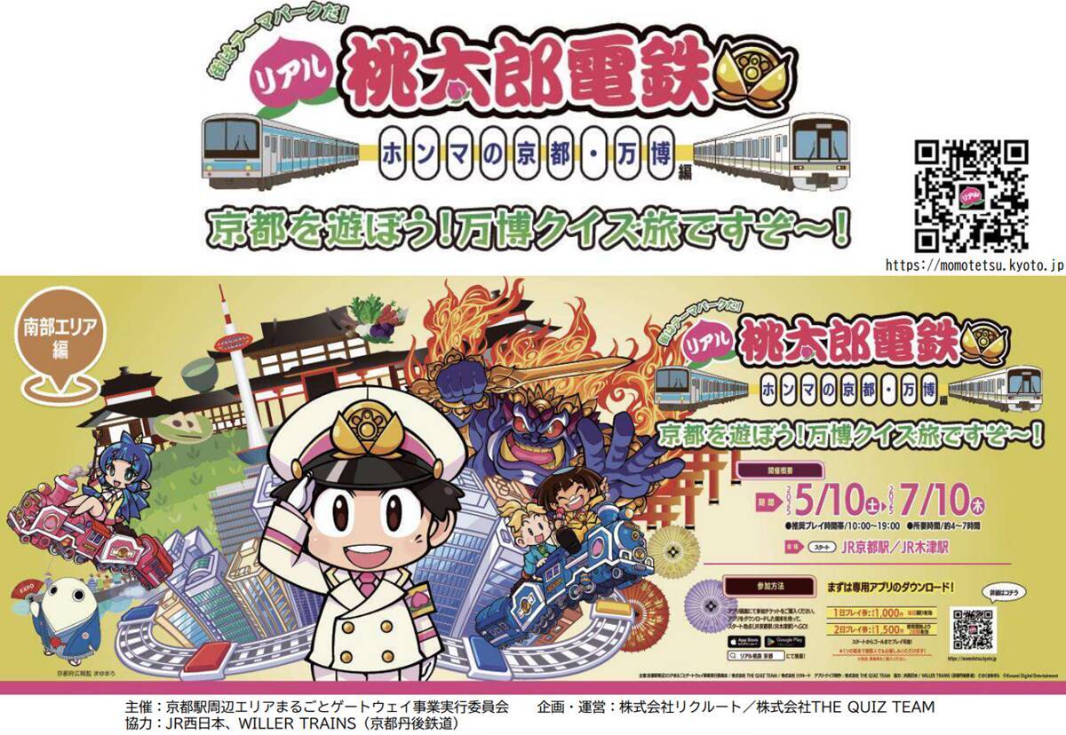 国民的ボードゲーム「桃太郎電鉄」が京都でリアルイベントに! 京都駅周辺エリアまるごとゲートウェイ事業実行委員会が、JR西日本とWILLER TRAINS(京都丹後鉄道)全面協力のもと、両沿線で街を巡る「リアル桃太郎電鉄~ホンマの京都・万博編~」を開催します。