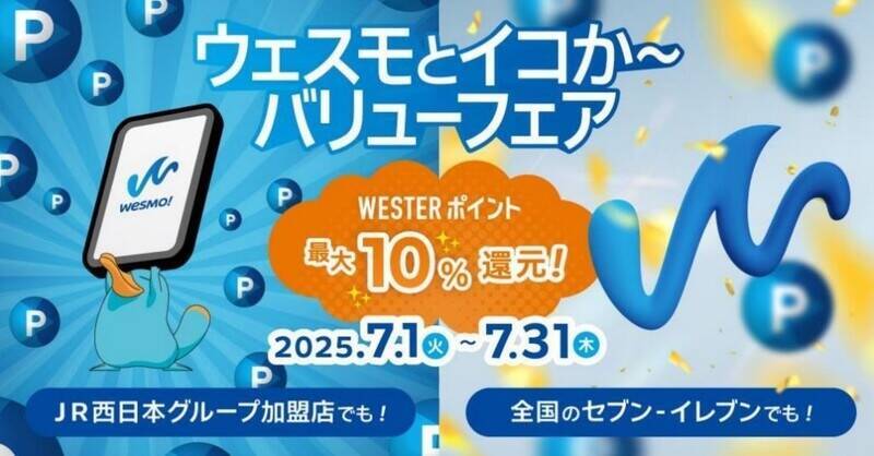 JR西日本グループは、スマホ決済アプリ「Wesmo!」かモバイルの「ICOCA」で買い物するとWESTERポイントが最大10%還元になる『ウェスモとイコか~バリューフェア』(通称:ウェスイコ)を2025年7月に開催します。