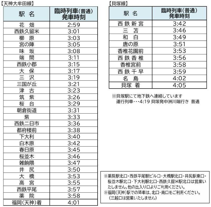 運行されるのは、花畑駅を2時59分に発車する福岡(天神)行きの普通列車と、西鉄新宮駅を3時42分に出発する貝塚行きの普通列車の2本です。