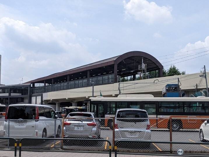 高架駅の大師前は3階が1面1線のホーム。1~2階にはクリニックや薬局がテナントとして入居します。