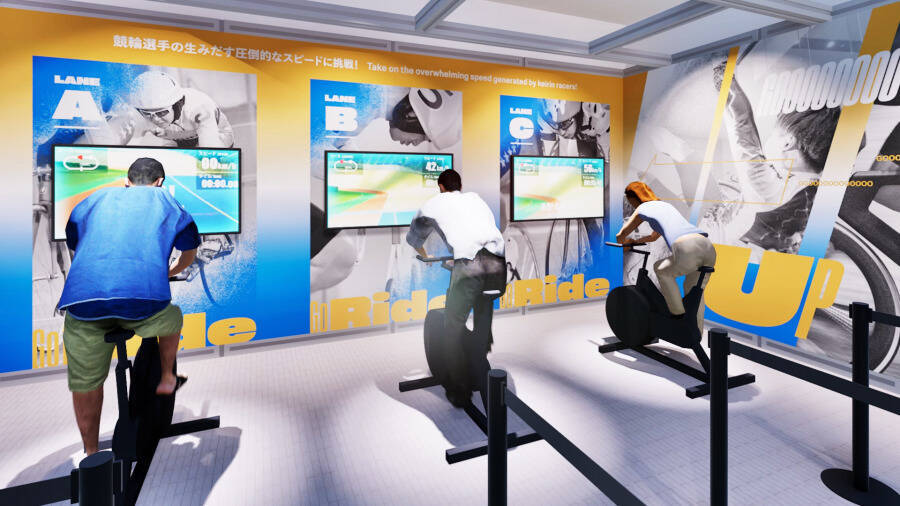 「ギャラリーWEST」では、目玉となる体験型コンテンツが集まります。「Dynamic! ふとももシアター」では、普段は見ることのできない映像と特別な空間演出により、超没入感の中で競輪のダイナミックさを体感できます。また、「Challenge! ふとももライド」では、利用者が実際に自転車を漕ぎ、画面上の競輪選手と白熱のレースを繰り広げることができます。