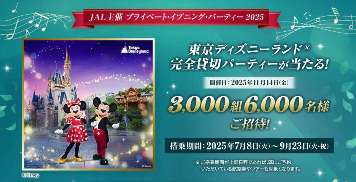 日本航空(JAL)が、東京ディズニーランドの完全貸切パーティーなどが当たる「JAL ハッピードリームキャンペーン 2025」を実施しています。このキャンペーンは、JALグループの国内線に2回搭乗することで応募可能で、JALマイレージバンク(JMB)会員でなくても参加できます。