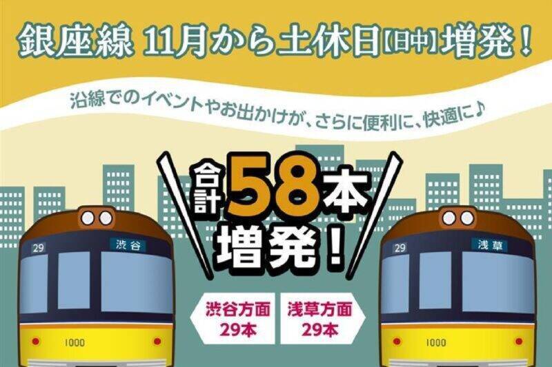 東京メトロ銀座線が11月1日(土)から実施する土休日ダイヤでは、日中時間帯の列車を58本増便し、運転間隔が短縮されます。