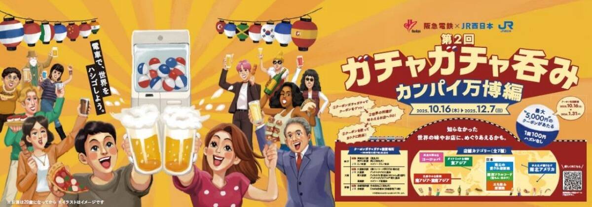 阪急電鉄とJR西日本は、両社の沿線飲食店で利用できるクーポンが当たる共同企画第2弾「ガチャガチャ呑み カンパイ万博編」を、2025年10月16日(木)から12月7日(日)まで開催します。1回100円でハズレなし、カプセルの中には最大5,000円分のクーポンが必ず入っています。