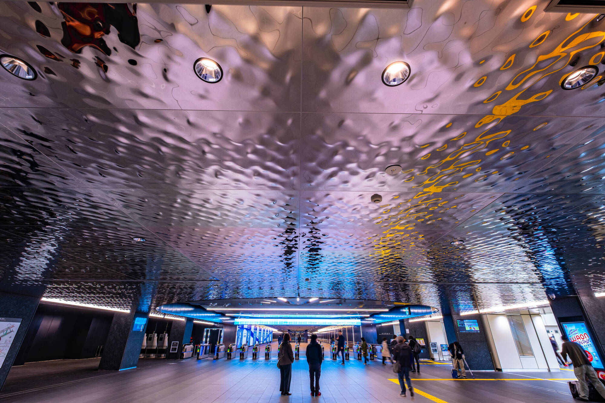 駅空間を特徴づけているのは、アルミ素材を折り紙の折り目のように加工した天井と、コンコース壁面に設置された全長約55メートルの大型サイネージです。天井には光や人の影が映り込み、サイネージの映像や色の変化と連動することで、通路全体が一体的に感じられるデザインとなっています。ホームは島式構造で、ホームドアの設置や光の誘導など、安全性と快適性の両立を図った構成です。