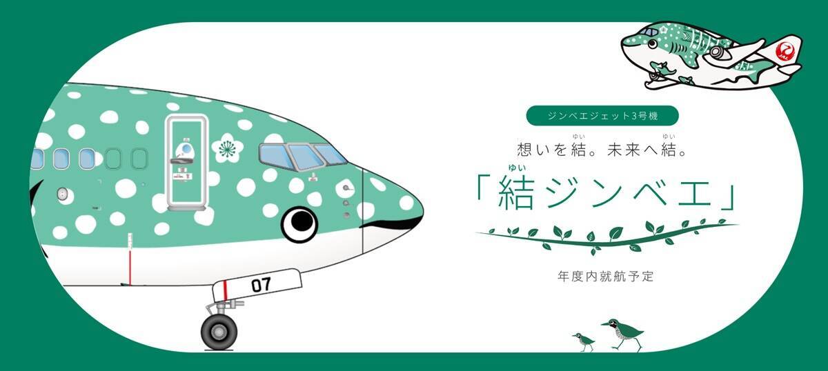 「結ジンベエ」はJTAの特別塗装機「ジンベエジェット」の3号機で、1号機の「青」と2号機の「ピンク」に続き、「緑色」を基調としたデザインで沖縄本島北部の自然と生物多様性を表現します。