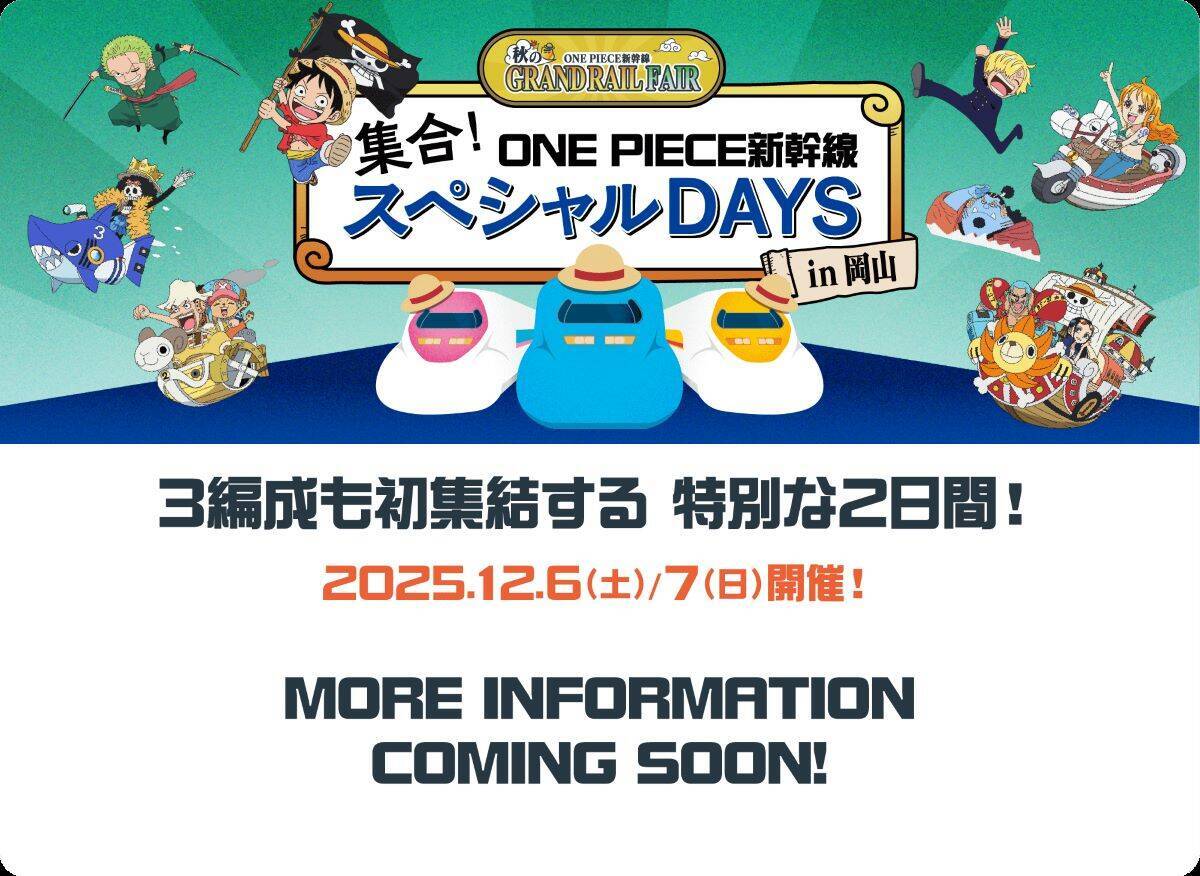 今回の目玉企画は、12月6日(土)に博多総合車両所 岡山支所で開催される「ついに集結!! 『ONE PIECE 新幹線』 3編成 車両展示会」です。山陽新幹線を彩る3編成が並ぶ姿を見られる貴重な機会となります。
