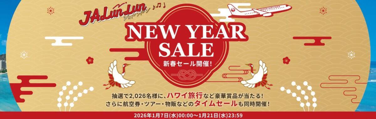 JAL(日本航空)は、2026年の幕開けを祝うビッグキャンペーン「JALunLun 新春セール 2026」が1月7日(水)から開催されています。注目の国内線片道7,700円~のタイムセールをはじめ、国内線特典航空券の最大2,500マイル割引、さらに抽選でハワイ旅行などが当たる「お年玉」企画まで、かつてない豪華な内容となっています。