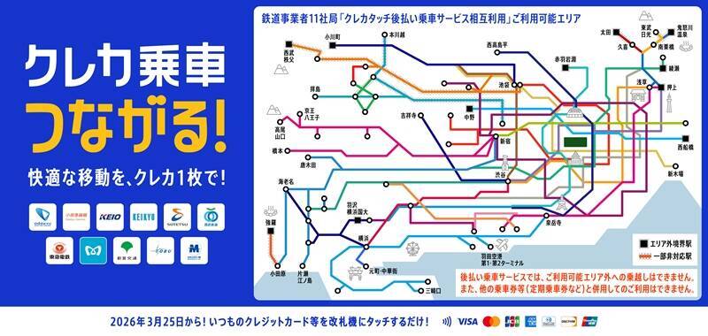 関東の鉄道事業者11社局の路線を対象とした、クレジットカード等のタッチ決済による「後払い乗車サービス」の相互利用がいよいよ始まります。各社局間の相互直通運転にも対応し、使い慣れたクレジットカード1枚で、複数の鉄道路線をシームレスに乗り継いで移動できるようになります。
