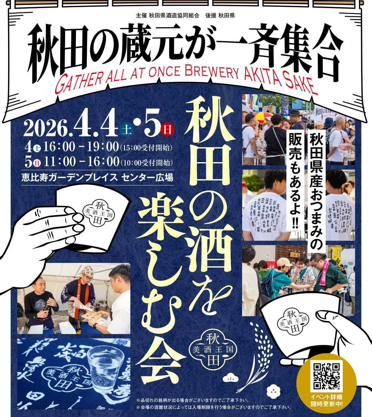 秋田県酒造協同組合は、2026年4月4日(土)~5日(日)の2日間、恵比寿ガーデンプレイス・センター広場で「秋田の酒を楽しむ会in東京」を開催します。