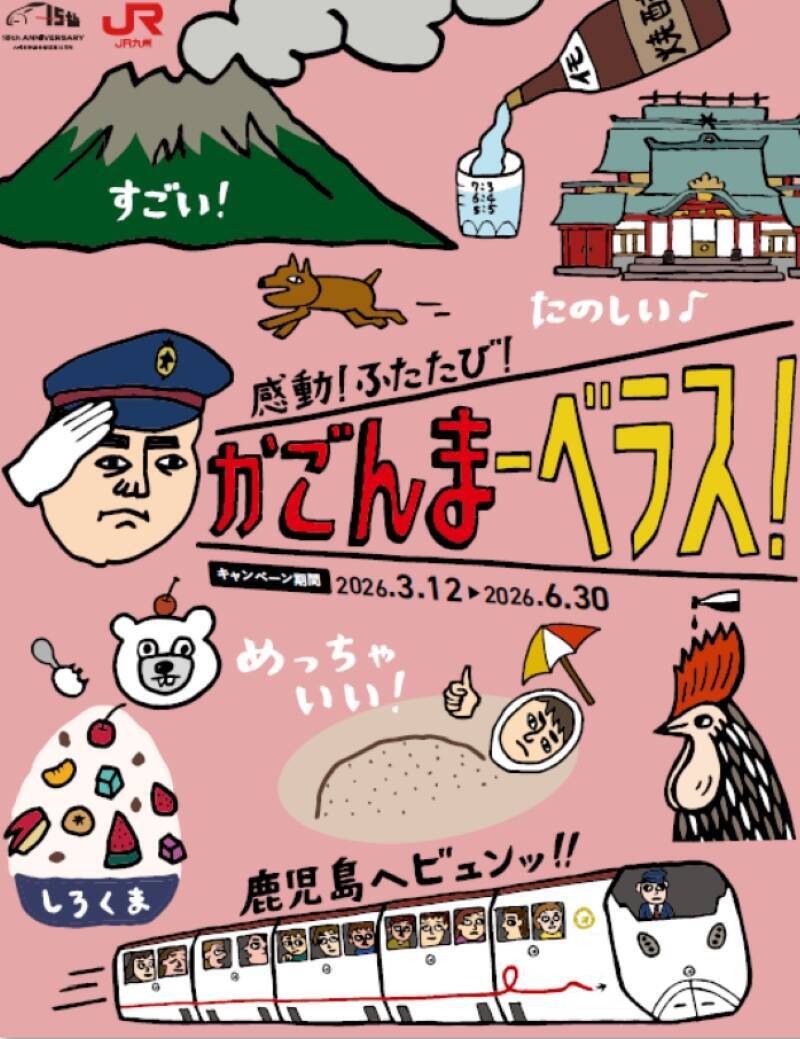 これまでの利用に感謝するとともに、さらに多くの方に新幹線に乗って鹿児島を訪れてもらうべく、JR九州とJR西日本は合同で観光キャンペーンを開催します。キャンペーン名称は、感動!ふたたび!「かごんまーベラス」。鹿児島を意味する方言「かごんま」と、「素晴らしい・驚き」を意味する「マーベラス(marvelous)」を組み合わせたユニークなタイトルです。15年ぶりに訪れる人も、何度も訪れたことのある人も、鹿児島県の観光素材の素晴らしさを改めて感じてほしいという思いが込められています。