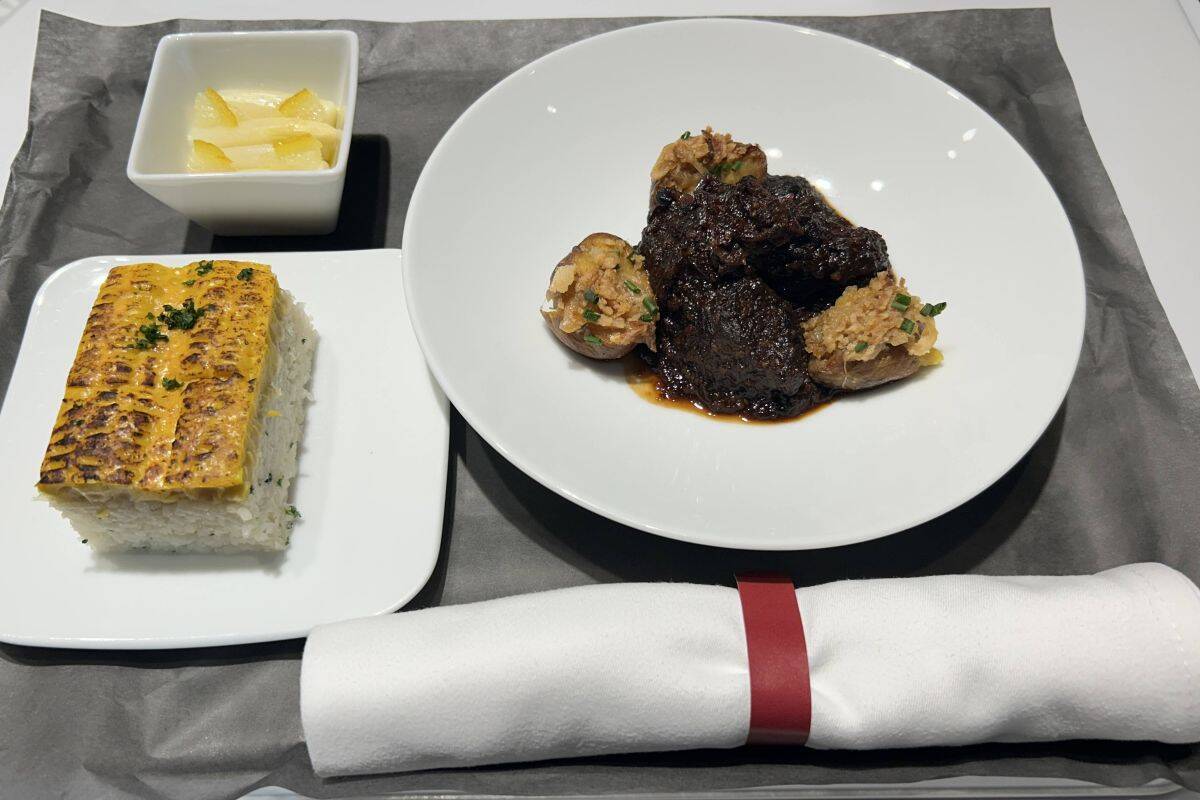 メインディッシュは、「国産牛の凝縮バルサミコ酢と赤ワイン煮」です。庄司シェフがコスト制限がある中で、国産牛にこだわったというこの料理。牛肉がとても柔らかく煮込まれていて、口に入れた瞬間にほろほろにとろけ、バルサミコ酢やバターの濃厚ソースとの相性も抜群の逸品。添えられているジャガイモは、「インカのめざめ」という甘くて濃厚な味わいと黄色い肉質が特徴の高級じゃがいもです。
