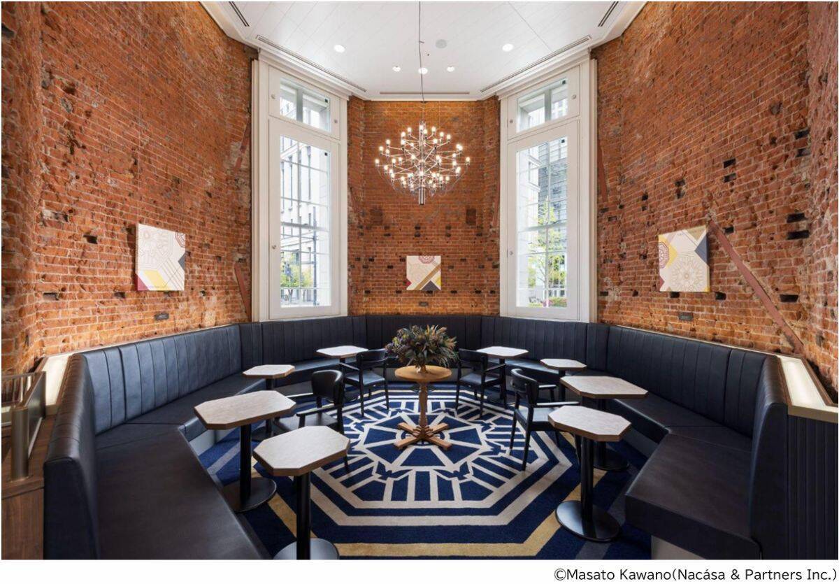 カフェの最大の魅力は、重要文化財である駅舎の息遣いを肌で感じられる空間設計にあります。コンセプトは「NEW CLASSIC TOKYO」で、店舗を囲むのは、1914年の創建当時から駅舎を支え続けてきた構造レンガ壁です。