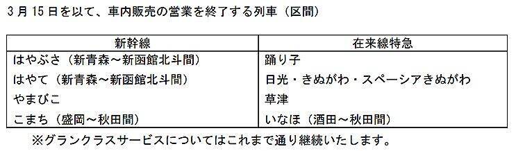3月15日から、新幹線 はやぶさ(新青森~新函館北斗)、はやて(新青森~新函館北斗)、やまびこ、こまち(盛岡~秋田)、在来線特急 踊り子、日光・きぬがわ・スペーシアきぬがわ、草津、いなほ(酒田~秋田)で車内販売をやめるって。