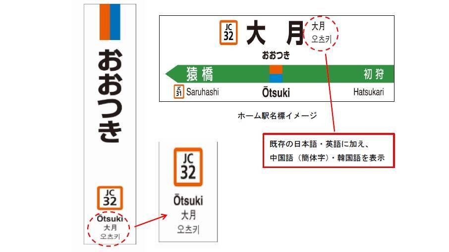 JR東日本は2019年3月29日、中央本線の相模湖~大月駅間へ「駅ナンバリング」を拡大し、駅名標の4ヵ国語表記を実施したことを発表しました。