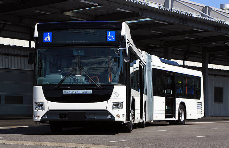 このハイブリッド連節バスは、国内の道路事情を踏まえた車両寸法にし、効率的な大量輸送を実現させるモデル。