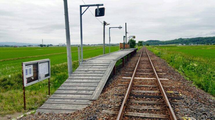 踏切から駅全体を見ています。かつては駅舎(待合室)が看板の辺りにありましたが、2012年(平成24年)に撤去されてしまいました。木の板のシンプルなホームがあるだけです。レールのバニシング・ポイントが見えそうな感じ。