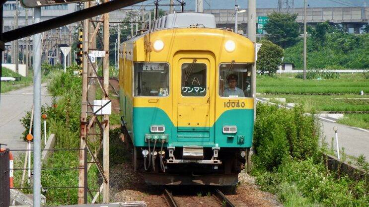 ホームで駅名標を撮っていたら上り普通電車、電鉄富山行が来ました。奥の方がこれから向かう宇奈月温泉方面です。