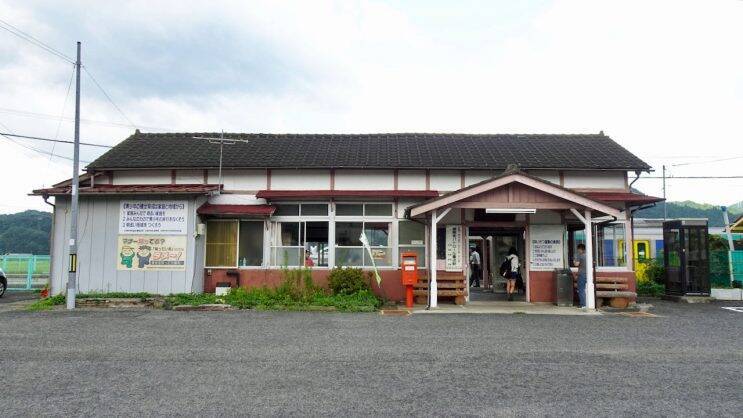 こちらはレンタカー撮影。木造駅舎を南側から撮っています。レンタカーで訪問した時は晴れたり曇ったりでした。前面展望の2019年8月25日(日)、列車交換が比較的長く停車したのでトップ画像の駅舎正面もその時のものです。この時も晴れたり曇ったりしています。ややっこしくてすみません。