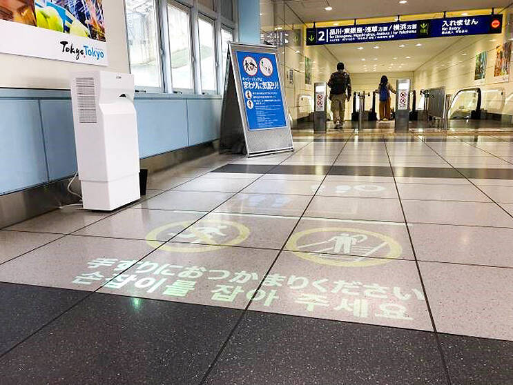 アニメーションで表現することで、訪日外国人などにも、直感的に案内できる。床面に投射することで、目線の低い子どもたちにも気づきやすい案内に。