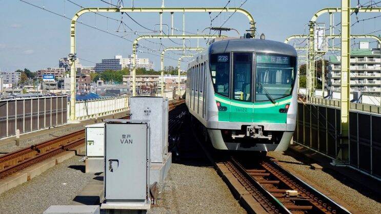 トップ画像。登戸駅からは(上り線は向ヶ丘遊園駅から)複々線化されているので内側の急行線を東京メトロ千代田線直通の準急我孫子行が出発してゆきます。