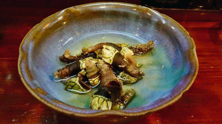 待つ間に「カメノテ」について、ウィキペディアによれば、『石灰質の殻を持つ岩礁海岸の固着動物で、カメノテ属唯一の種である。甲殻類ミョウガガイ科に分類される。』という良く分からないもので、要は「フジツボ(コレも大好物)」の親戚の様なものらしいですね。四国、愛媛県で特によく食べられるそうです。道後温泉の居酒屋でも食べました。