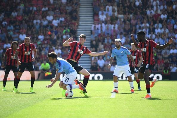 8月25日に行われたボーンマス対マンチェスター・シティの一戦。シティのMFシルバ(21番)がPA内でレルマ(8番)に倒されるも、ノーファウル判定に photo/Getty Images