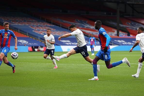 2トップといってもアグエロが少し下がった位置で受けており、ジェズスとは縦関係となっていた。クリスタル・パレスはDFとMFの間を狭く設定しており、序盤は少し攻めあぐねる展開に。敵陣で低い重心から相手を抜き去るドリブルを披露したアグエロのところからズレが生じており、チャンスが生まれ始めていた。