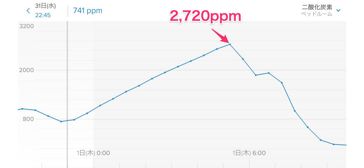 寝る前に741ppmだった濃度が、寝ている間にぐんぐん上昇し、朝には2,720ppmに到達。大気中のCO2濃度は約405ppmとされているので、一晩でその6.7倍になった計算です。