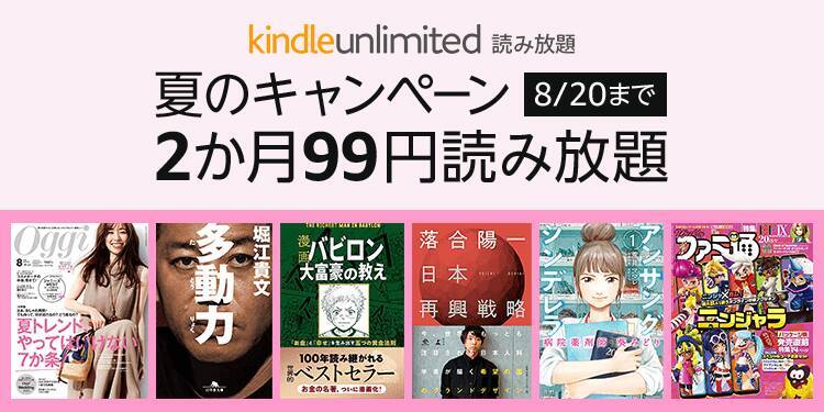 また、月額980円の読み放題サービスKindle Unlimitedでは、期間限定で99円で2ヶ月間利用できるキャンペーンを開催していますので、こちらもあわせてどうぞ。