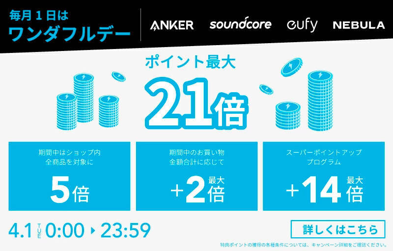 楽天ワンダフルデーで、対象のAnker製品がポイント最大21倍セールを開催しています。