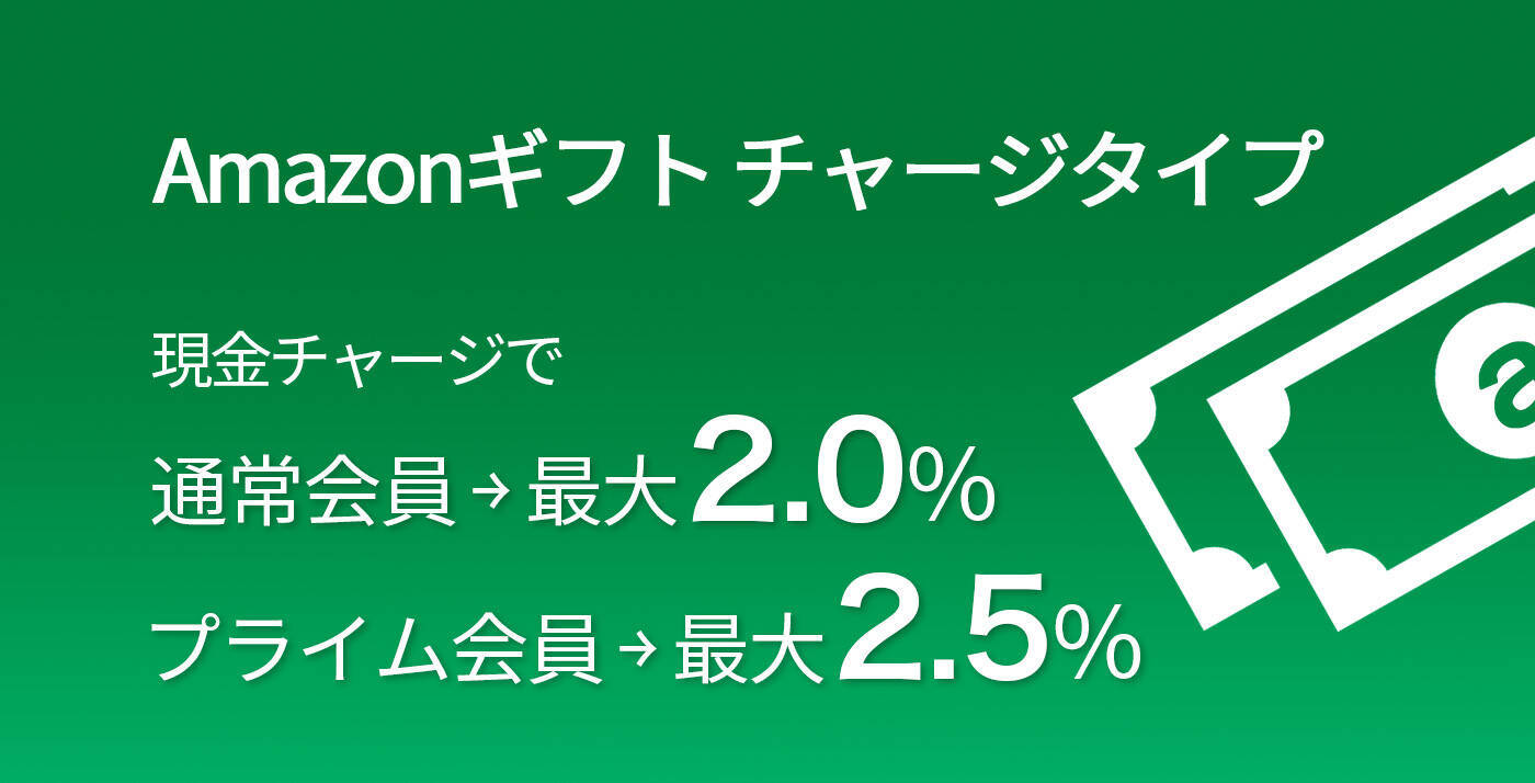 また、「Amazonギフトチャージタイプ」を現金でチャージしておくと、最大2.5%のポイントが付与されます。Amazonでよく買い物をする方はお忘れなく。