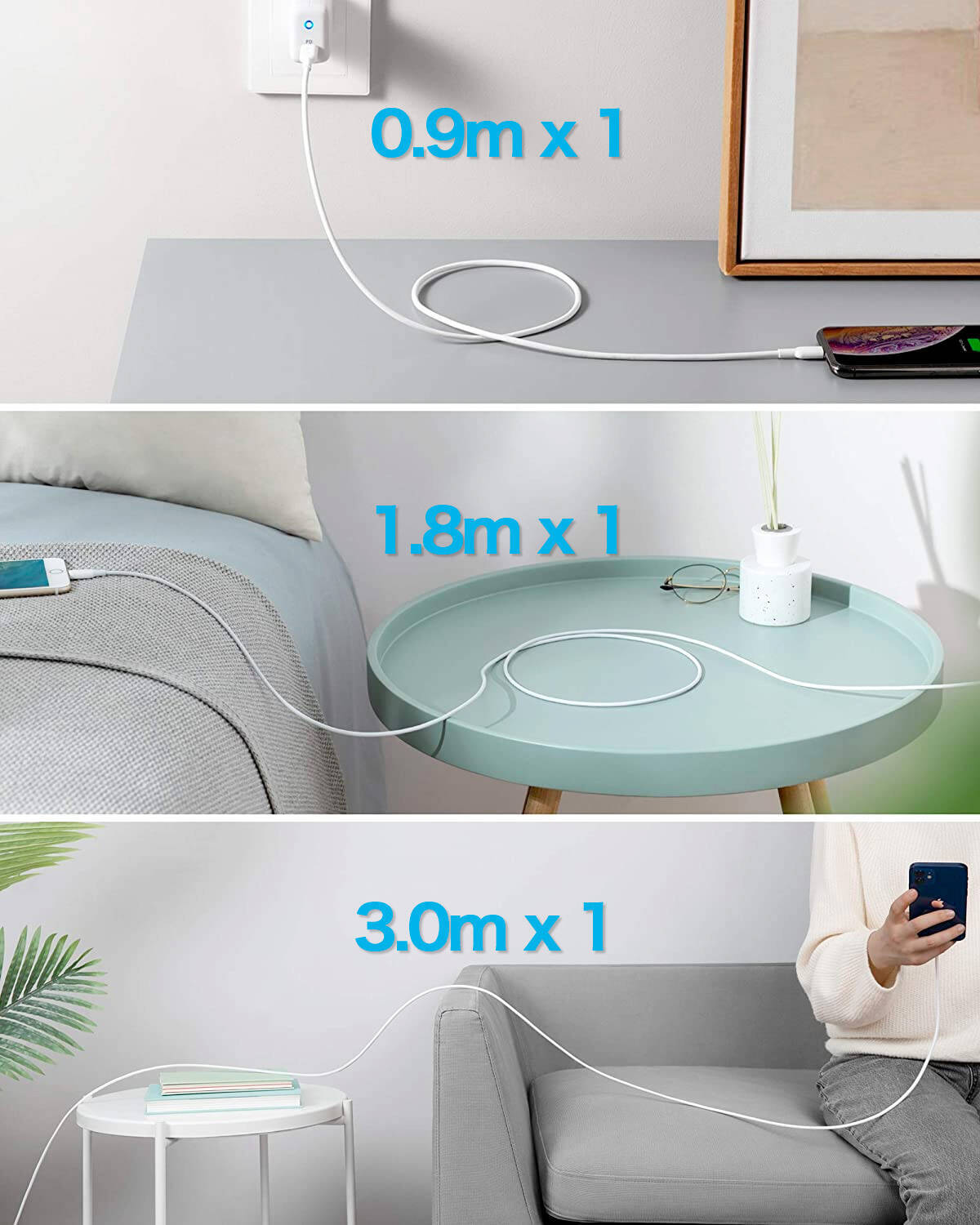 0.9m・1.8m・3.0mの3本セットで、0.9mは携帯用、1.8mや3.0mはリビングやベッド用など、利用シーンに合わせて使い分けができます。