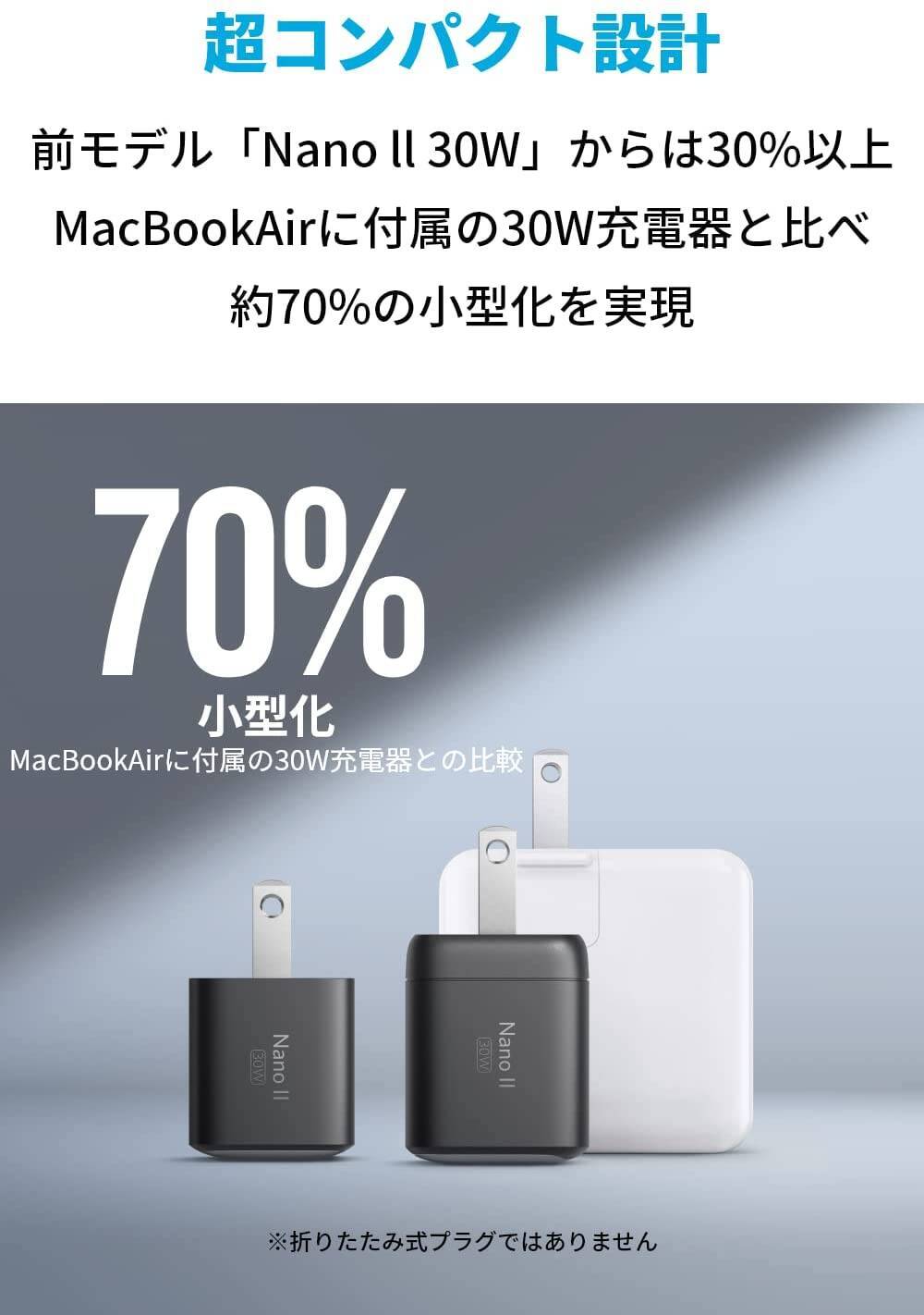 これまで「Anker Nano IIシリーズ」の最小だった「Nano II 30W」をさらに30%小型化し、重さもわずか34gへと軽量化されています。